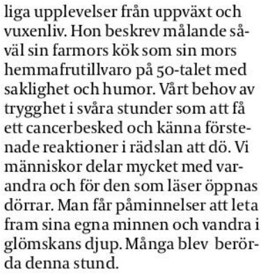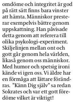 och pekat på många brister i vårt sätt att se på äldre. Vågar jag bli gammal? Hon tar liknelsen med Tove Janssons Knyttet, Ensam och rädd men som till sist får trygghet. Vem är gammal? "När man inte är nyfiken på morgondagen längre", säger hon. Westerholm refererade till en del forskare och påvisade vikten av stimulans för hjärtats harmoni i exempelvis äldres boende. Detta borde vara ett stort politikeransvar. Vidare gav hon en exposé över åldersdiskriminering som förekommer såväl i arbetsliv som i sjukvård dagligdags. En ny lag om detta fenomen träder i kraft från och med 2013. Vad är den viktigaste känslan för oss? Jo, att känna sig behövd.