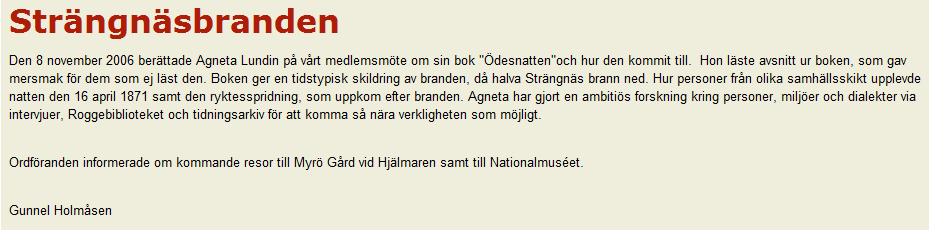 Marianne Larsson och Anna-Lisa Ström. Börje H Larsson riktade ett speciellt tack till avgående Gunnar Swärd för hans mångåriga insats som kassör och till Kirsten Jonsson för hennes arbete i programkommittén. Mötet avslutades med en soaré av ”Aktiva Roare” från Eskilstuna. |